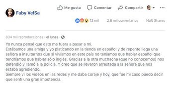 "Yo nunca pensé que esto me fuera a pasar a mí", escribió Velasquez en su cuenta de Facebook. "Estábamos una amiga y yo platicando en la tienda en español y de repente llega una señora a insultarnos. Que si vivíamos en este país no teníamos que hablar español, que tendríamos que hablar solo inglés. Gracias a la otra muchacha (que no conocemos). Nos defendió y llamó a la policía. Y creo que se llevaron arrestada a la señora que nos estaba agrediendo. Siempre vi los videos en las redes y me daba coraje, y hoy, que fue mi caso, puedo decir que sentí una gran impotencia".