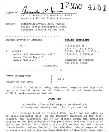 Fue Kourani quien decidió cambiar de abogados al declararse inocente y asegurar que muchas de las declaraciones que el FBI le atribuye ahora no son ciertas. El juez federal Alvin K. Hellerstein le negó fianza porque, dice, ahora más que nunca Kourani tiene muchos incentivos para intentar escaparse del país y porque representa un "sustancial" peligro para los demás.