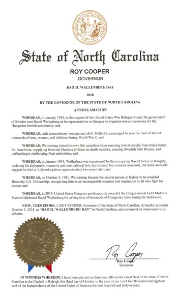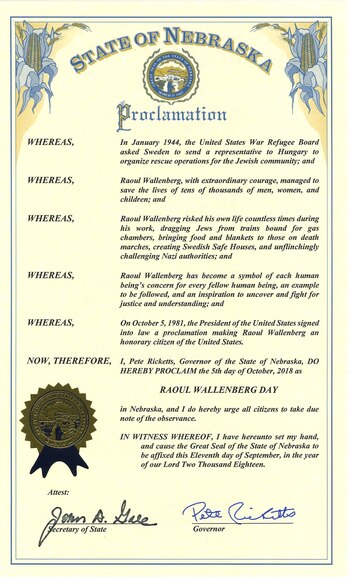 Dos estados de los Estados Unidos, Nebraska y Carolina del Norte, se han sumado a la campaña para declarar al 5 de octubre de 2018 como el Día Raoul Wallenberg, en honor al diplomático sueco que luchó para salvar a miles de judíos húngaros durante el Holocausto y murió como prisionero de la Unión Soviética tras el fin de la Segunda Guerra Mundial.