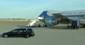 Con un arnés con los colores de la bandera estadounidense, el labrador amarillo estaba en la pista de Houston, Texas, para acompañar el ataúd de su amo a bordo del avión presidencial, Air Force One, prestado por Donald Trump.
