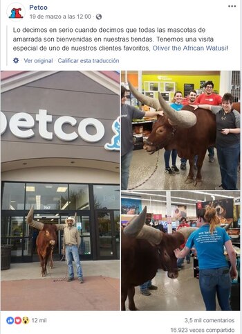 Dos propietarios de un enorme toro lo llevaron a comprar su alimento a una tienda Petco como si fuera una "mascota" cualquiera, sin embargo el animal no pasó desapercibido ya que pesa más de 900 kg., además de que tiene grandes y puntiagudos cuernos.