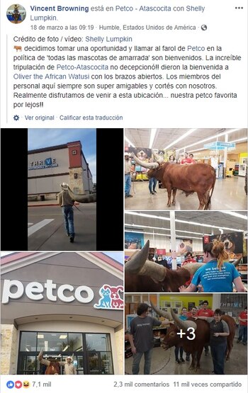 En el video tomado por Shelly, se puede ver a Vincent entrando en el Petco con Oliver siguiéndolo. Incluso con sus cuernos gruesos y largos, el novillo no tuvo problemas para atravesar las puertas delanteras del negocio.