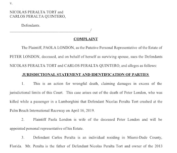 Nicolás Peralta Tort, de 18 años, hijo de del acaudalado empresario Carlos Peralta, se impactó contra el muro de contención de la pista de carreras durante una lección de manejo privada. El instructor, Peter London, de 38 años, falleció en el accidente, reportó este miércoles la agencia de noticias EFE.