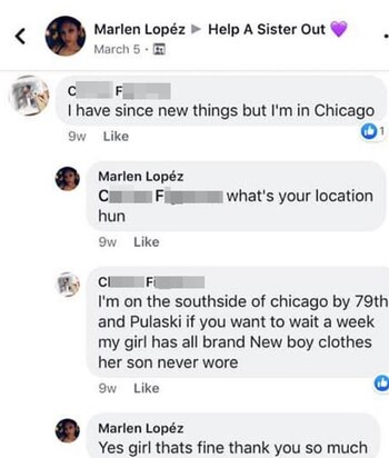 Las capturas de pantalla obtenidas por CBS Chicago muestran que el 6 de marzo, Ochoa Uriostegui publicó un mensaje para el grupo de Facebook ahora desaparecido, que se titulaba "Help Sista Out". Su fecha de parto se acercaba, escribió, y todavía había disponibles muchos de los suministros que ella necesitaba.