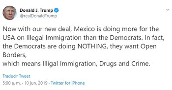 "Ahora con nuestro nuevo acuerdo, México hace más por EEUU en inmigración ilegal que los demócratas. De hecho, los demócratas no están haciendo NADA, ellos quieren Fronteras Abiertas, lo que significa inmigración ilegal, drogas y crimen".