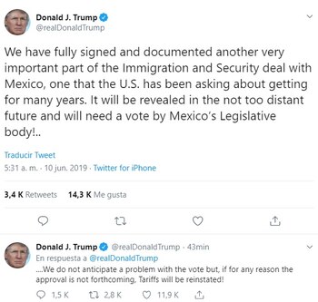 En un tuit publicado en su cuenta oficial a primera hora del lunes, el mandatario de extracción republicana aseguró que con el acuerdo que se cerró el viernes por la noche, las autoridades mexicanas detendrán la crisis migratoria que ha dejado un número récord de arrestos este año en la frontera.