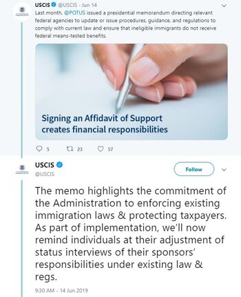 "El documento destaca el compromiso de la Administración por hacer cumplir las leyes de inmigración existentes y proteger a los contribuyentes. Como parte de la implementación, ahora les recordamos a las personas en sus entrevistas sobre el estatus migratorio, de las responsabilidades de sus patrocinadores bajo las leyes y regulaciones existentes", señaló la agencia en Twitter.