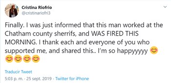 Por esta agresión hacia Kiki, posteriormente se supo que se llamaba Cristina Riofrio, la oficina del Sheriff del Condado de Chatham despidió a Walter Browning, después de que el Sheriff de este condado, John T Wilcher, supiera del video y la investigación que lo rodeaba.
