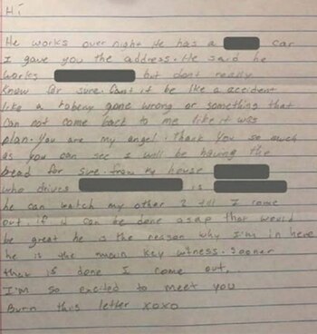 “Si puedes hacerlo pronto, estaría genial. Él es la razón por la que estoy aquí. Él es el testigo principal [de la acusación]. En cuanto esté hecho podré salir de aquí. Estoy deseando conocerte. Quema esta carta, besos y abrazos”, escribió en la última misiva.