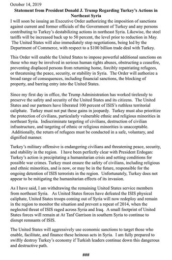 “Pronto emitiré una Orden Ejecutiva que autoriza la imposición de sanciones contra los funcionarios actuales y anteriores del Gobierno de Turquía y cualquier persona que contribuya a las acciones desestabilizadoras de Turquía en el noreste de Siria”, señaló el mandatario en un comunicado divulgado en sus redes sociales.