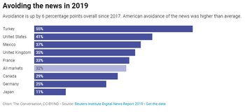 Las formas comunes de lidiar con estas emociones negativas incluían seleccionar de cerca qué noticias escuchar, reducir el tiempo dedicado a las noticias o incluso evitarlas por completo. La evasión de noticias ha ido en aumento en los Estados Unidos. Según un informe de la Universidad de Oxford, mientras que el 38% de los estadounidenses dijeron que a veces o con frecuencia evitaban las noticias en 2017, esa cifra aumentó al 41% en 2019. Eso está por encima del promedio mundial del 32% para ese año.