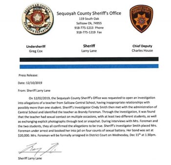 En la declaración jurada, Smith informó que el superintendente de la escuela, Larry Henson, había recibido un informe de la Oficina de Oklahoma de la Junta de Educación del Estado informándole que una persona anónima había denunciado un posible “contacto sexual inapropiado y el intercambio de fotos inapropiadas”, entre Foreman y posiblemente dos estudiantes actuales, además de un estudiante anterior en la Escuela Central".