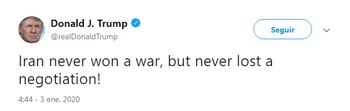 Después de 10 horas de haber fijado la bandera de Estados Unidos como primer mensaje en su cuenta de Twitter y haberse limitado luego a retuitear mensajes alusivos al operativo que mató al militar más importante de Irán y al comandante de Hezbollah en Irak, Donald Trump escribió su primer mensaje en la red social: “Irán nunca ganó una guerra, pero nunca perdió una negociación”.
