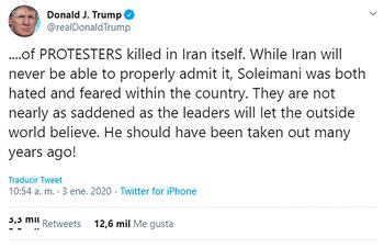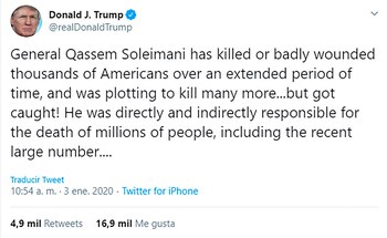 Trump agregó más tarde que “el general Qassem Soleimani ha asesinado o herido seriamente a miles de estadounidenses a lo largo de un gran período de tiempo, y estaba planeando asesinar muchos más... ¡pero fue atrapado!”.