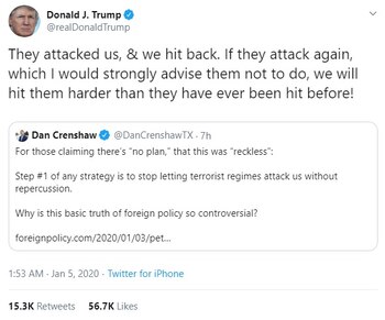 Asimismo, ha subrayado que Estados Unidos ha gastado dos billones de dólares en equipamiento militar. “¡Somos el más grande y el mejor del mundo! Si Irán ataca una base o a estadounidenses, usaremos algunos de nuestros nuevos y hermosos equipamiento militar contra ellos sin dudarlo”, escribió en Twitter.