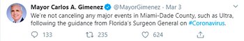 El martes, el alcalde del condado de Miami-Dade, Carlos A. Giménez, había confirmado en su cuenta de Twitter que el festival continuaría según lo planeado: “No cancelaremos ningún evento importante... como Ultra, siguiendo las instrucciones del Cirujano General de Florida sobre #Coronavirus”.