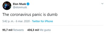 “Gracias por detener el pánico, Elon”, le respondió un usuario de Twitter ante su comentario sobre el coronavirus, y el portal especializado Mashable repudió al empresario y advirtió: “Vale la pena señalar, una vez más, que Musk no es ni epidemiólogo ni experto en enfermedades infecciosas”.