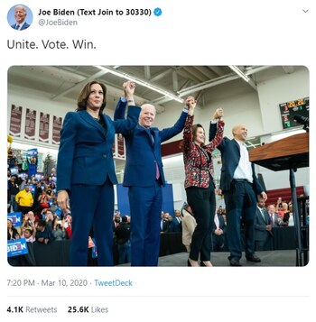 En un discurso transmitido en vivo después de que los medios proyectaran su victoria en Missouri, Mississippi y Michigan, Biden tendió la mano a su rival, un gesto poco usual en una interna muy crispada.