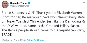 El presidente culpó de la caída de Sanders a la senadora Elizabeth Warren, quien también pertenece al ala izquierdista del partido y se retiró hace un mes de la contienda demócrata. “¡Si no fuera por ella, Bernie habría ganado casi cada estado el supermartes! Esto ha acabado tal y como querían los demócratas y el DNC (Comité Nacional Demócrata, secretariado), como ocurrió con el fiasco de la corrupta Hillary”, zanjó Trump.