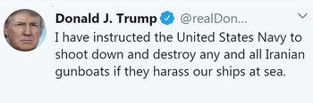 “He dado orden a la Marina de Estados Unidos de que derribe y destruya cualquier buque de guerra iraní si acosan a nuestros barcos en el mar”, expresó el mandatario en Twitter.