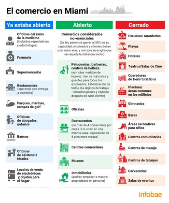 A partir de hoy el condado ha autorizado a los comerciantes, catalogados como no esenciales, abrir sus puertas. Los centros comerciales más grandes, como el Aventura Mall o el Dolphin Mall, han decidido esperar hasta el jueves para abrir sus puertas, y las ciudades de Miami, Miami Beach, Miami Gardens y Hialeah lo harán el miércoles. Pero cerca de un 50 por ciento del condado, compuesto en su mayoría por pequeños comerciantes, ya iniciaron hoy sus actividades.