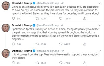 “El portavoz habla estúpidamente en nombre de China, tratando desesperadamente de desviar el dolor y la carnicería que su país extendió por todo el mundo”, ha indicado Trump a través de una serie de mensajes publicados en su cuenta en la red social Twitter.
