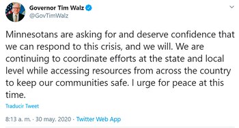 El político dijo que el estado continúa coordinando esfuerzos a nivel estatal y local para hacer frente a las protestas que han estallado en todo Minnesota y en ciudades de todo Estados Unidos. El gobernador finalizó su tuit con una súplica: “Insto por la paz en este momento”.