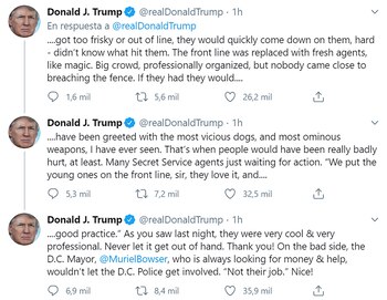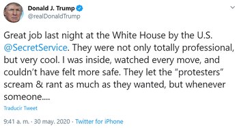 “Los llamados ‘manifestantes’ dirigidos profesionalmente en la Casa Blanca tenían poco que ver con la memoria de George Floyd. Estaban allí solo para causar problemas. El Servicio Secreto (encargado de la seguridad en la Casa Blanca) los manejó fácilmente. Esta noche, entiendo, hay NOCHE DE MAGA (Make America Great Again, el lema electoral de Trump) en la CASA BLANCA???”, tuiteó.