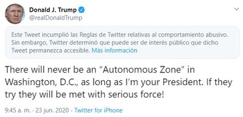 “Nunca habrá una ‘Zona Autónoma’ en Washington DC mientras yo sea presidente. Si lo intentan, ¡se enfrentarán con una gran fuerza!”, escribió el presidente, en medio de protestas desde hace semanas en todo el país contra la brutalidad policial y el racismo.
