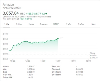 Las acciones del gigante tecnológico Amazon rompieron este miércoles otra marca, al superar la cotización de USD 3.000 por título, en una jornada de grandes ganancias que llevaron al índice Nasdaq a otro máximo histórico.