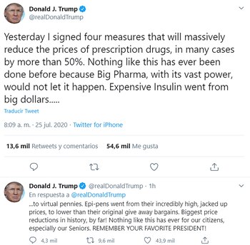 Este sábado, el propio jefe de Estado habló al respecto en Twitter. “Ayer firmé cuatro medidas que reducirán masivamente los precios de los medicamentos recetados, en muchos casos en más del 50%. Nunca antes se había hecho algo así”, expresó.