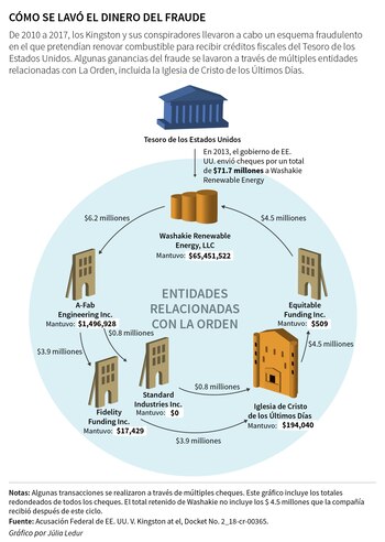 Los hermanos Jacob e Isaiah se declararon culpables de un cargo que describe la conspiración que usó a la iglesia y a otras entidades de La Orden para lavar dinero. Cuando CJI le preguntó al vocero de la Cooperativa, Kent Johnson, sobre el papel de la iglesia en el fraude, respondió: “Que yo sepa, cualquier dinero pagado a negocios propiedad de los miembros de la DCCS (sigla en inglés de la Sociedad Cooperativa del Condado de Davis) obedeció a servicios legítimos prestados o para reembolsar dinero prestado al señor Kingston o a entidades relacionadas con WRE ( Washakie Renewable Energy).