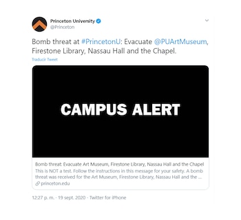 “Esto NO es una prueba. Siga las instrucciones de este mensaje para su seguridad. Se recibió una amenaza de bomba para el Museo de Arte, la Biblioteca Firestone, el Salón Nassau y la Capilla”, escribió en su cuenta oficial de las redes sociales la universidad norteamericana de Princeton a las 10:27, hora local.