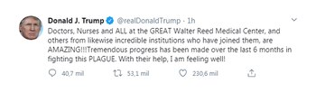 El propio presidente, de todas formas, dejó su agradecimiento en Twitter. “Médicos, enfermeros y TODO el personal de GRAN Hospital Walter Reed y las demás instituciones similares son ESTUPENDAS!!! SE han conseguido enormes progresos en los últimos seis meses para combatir esta PLAGA. Con su ayuda, me siento bien!”, escribió en su cuenta personal.