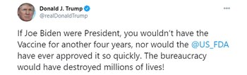 “Si Joe Biden fuese presidente, no tendrían la vacuna por otros cuatro años, ni la FDA la aprobaría así de rápido. ¡La burocracia hubiese destruido millones de vidas”, sostuvo.