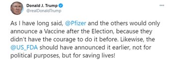 “Como he dicho durante mucho tiempo -añadió-, Pfizer y las otras (farmacéuticas) solo iban a anunciar la vacuna después de las elecciones, porque no tenían el coraje de hacerlo antes. Asimismo, la FDA debió haberlo anunciado antes, no con fines políticos, ¡sino para salvar vidas”.