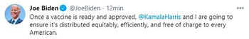“Una vez que la vacuna este lista y sea aprobada, Kamala Harris y yo nos aseguraremos que se distribuya de manera equitativa, eficiente y sin costos para todos los estadounidenses”, escribió el mandatario en su cuenta de Twitter.