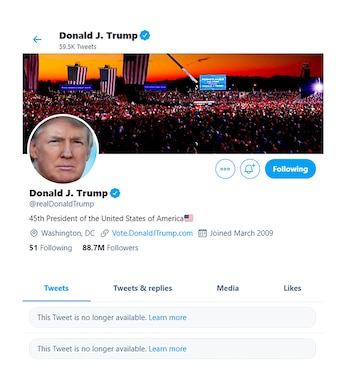 En un breve comunicado, Twitter indicó a su vez que “futuras violaciones de las reglas, incluyendo las políticas de integridad cívica y amenazas violentas, tendrán como consecuencia la suspensión permanente” de la cuenta del mandatario saliente.