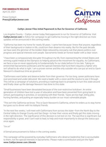 Jenner añadió que su candidatura “será una campaña de soluciones, proporcionando una hoja de ruta de vuelta a la prosperidad”.
