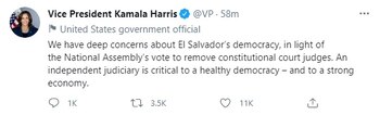 “Nos preocupa profundamente la democracia de El Salvador, a la luz de la votación de la Asamblea Nacional para destituir a los jueces del tribunal constitucional”, aseguró Kamala Harris en su cuenta de Twitter. Y agregó: “Un poder judicial independiente es fundamental para una democracia sana, y para una economía fuerte”.
