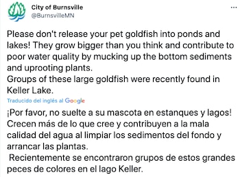 “Algunos peces de colores pueden parecerles a algunos una adición inofensiva al cuerpo de agua local, pero no lo son”, advirtió el Departamento de Recursos Naturales de Minnesota a The Washington Post.