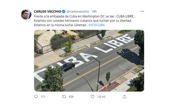 “Frente a la embajada de Cuba en Washington DC se lee: CUBA LIBRE. Estamos con ustedes hermanos cubanos que luchan por su libertad. Estamos en la misma lucha: Libertad”, escribió en su cuenta de Twitter Carlos Vecchio, el delegado diplomático ante la Casa Blanca del líder opositor venezolano Juan Guaidó, al advertir sobre la pintada.