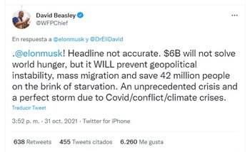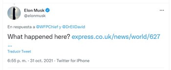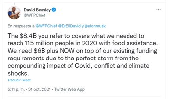 Musk estaba respondiendo a los comentarios de David Beasley, director del Programa Mundial de Alimentos de la ONU, quien repitió un llamado de este mes pidiendo a multimillonarios como Musk que “den un paso al frente ahora, por única vez”.