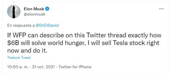 Si el Programa Mundial de Alimentos, utilizando una contabilidad transparente y abierta, “puede describir en este hilo de Twitter exactamente cómo USD 6 mil millones resolverán el hambre mundial, venderé acciones de Tesla ahora mismo y lo haré”, escribió Musk en una publicación de Twitter.