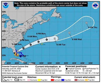 Tras alcanzar esta noche la costa floridana del Golfo de México se pronostica que este sistema salga de nuevo al mar en las próximas horas al desplazarse rápidamente a una velocidad de 30 km/h (18 m/h).