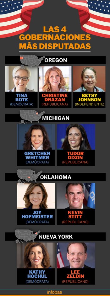 Por último, en Nueva York, la situación también es de final abierto. Andrew Cuomo llegó a sonar como posible candidato a la presidencia cuando se convirtió en la cara de la lucha contra el COVID-19. Pero luego llegó el escandalo de los abusos sexuales y se vio obligado a renunciar. En su lugar quedó la vicegobernadora Kathy Hochul. Hochul busca ahora una reelección, y si bien es popular, nadie se atreve a afirmar que le ganará al candidato republicano Lee Zeldin. La contienda ha tomado tanta relevancia nacional que el republicano Ron DeSantis ha viajado desde Florida para apoyar a Zeldin, y tanto Bill Clinton como Barack Obama han salido a hacer campaña por Hochul.
