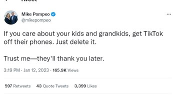 “Si te importan tus hijos y nietos, saca TikTok de sus teléfonos. Solo bórralo. Confía en mí, te lo agradecerán después”, escribió Pompeo en la red social.