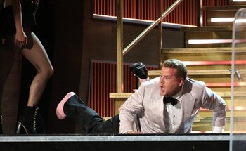 El primer acto de James Corden fue precisamente una sátira de los errores que pueden pasar en una transmisión en vivo: el elevador de la tarima se trabó, se le cayó un zapato y el micrófono falló.