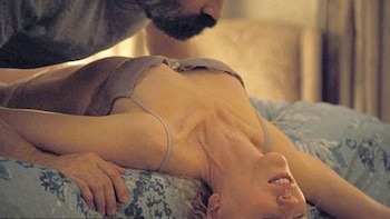 La actriz, de 50 años, aparece con lencería de encaje, mientras se revuelve en una cama antes de darse un encuentro humeante con el novio de su personaje.