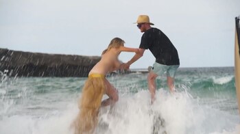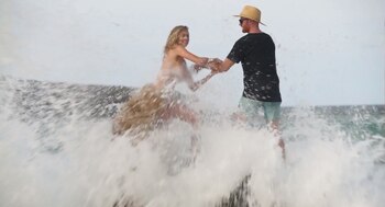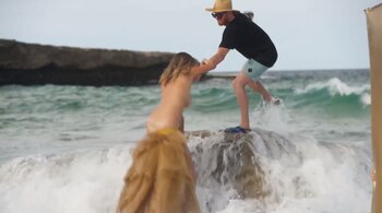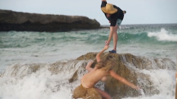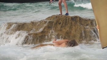 La modelo estaba posando en topless sobre una roca en la isla de Aruba cuando fue golpeada por una ola que le hizo perder el equilibrio y caer al agua.